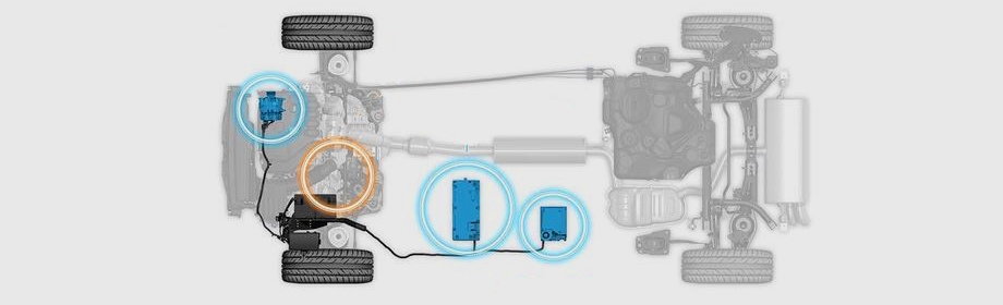 Синими кружками обведены (слева направо): интегрированный стартер-генератор, 48-вольтовая батарея, конвертер постоянного тока. В жёлтом кружке — электродвигатель, встроенный в трансмиссию. В более сложном исполнении, MHEV Plus, к описанным выше компонентам добавлен ещё один электромотор, способный самостоятельно приводить переднюю ось, а также рекуперировать энергию на торможении даже с остановленным ДВС. Фактически это уже полноценный гибрид, хотя и не особенно мощный. Отдача второго электродвигателя составляет 35 л.с. Это, конечно, далеко не 102 силы, как у «заряжаемого» Гольфа GTE, но уже не так мало, как в базовой системе MHEV. При этом MHEV Plus может быть двух версий: с электроприводом на передней оси и на задней (последний вариант был успешно опробован на Тигуане).