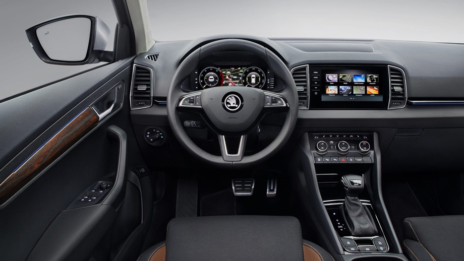 В салоне всё как обычно. За исключением накладок из нержавейки на руль и педали, новых чехлов для сидений с контрастными швами и надписями Scout. Для водителя заготовлен «виртуальный кокпит» (имеется в виду цифровая приборка), для пассажиров раздаётся Wi-Fi. Источник: https://www.drive.ru/news/skoda/5b601f0aec05c45616000050.html