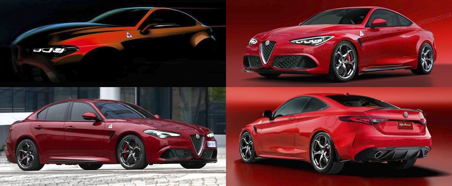 Сравните официальный тизер GTV (вверху слева) с эскизами журнала Car (справа). Внизу слева — «отправная точка», седан Giulia Quadrifoglio. Источник: https://www.drive.ru/news/alfaromeo/5b76d69bec05c45216000072.html