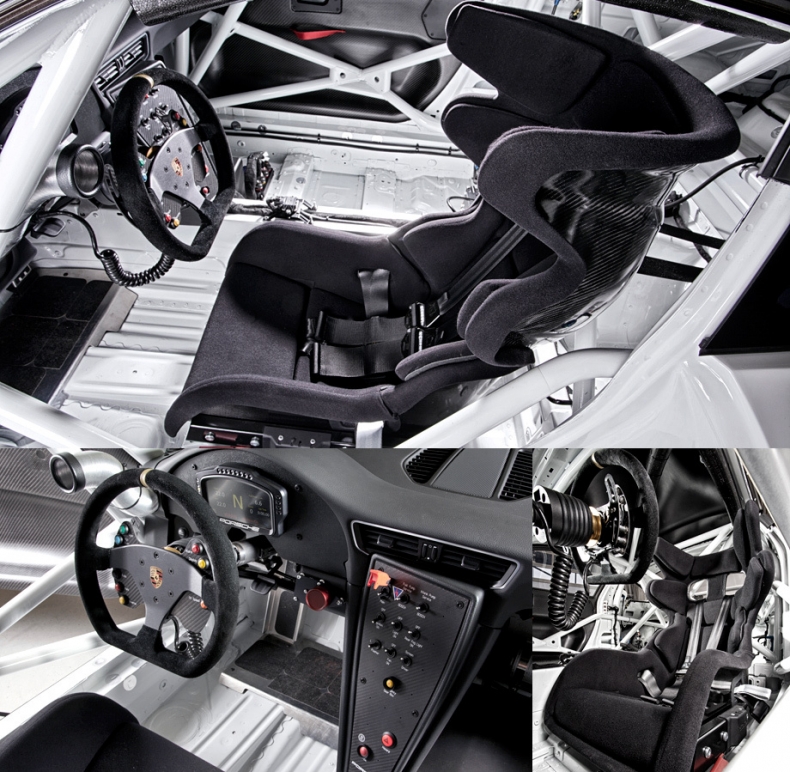 Интерьер ориентирован на пилота и выделяется отсутствием лишних деталей. Тут установлены скошенный снизу цельный руль, панель управления, центральный дисплей с показателями, гоночные сиденья и каркас безопасности. Источник: http://www.drive.ru/autosport/porsche/50c6efc3b72142600a00009f.html