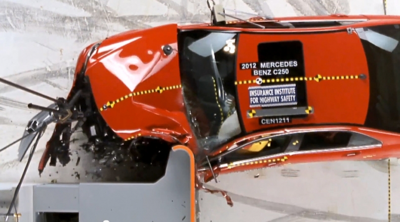 При перекрытии всего в четверть ширины кузова вся сила удара приходится на один борт, так что деформации боковины получаются ужасающими. По такой методике американцы разбили 11 среднеразмерных люксовых (или почти люксовых) седанов 2012 модельного года. Как и следовало ожидать, повреждения кузовов при столь жёстком экзамене оказались большими. По результатам нового краш-теста, защита, предоставляемая моделями Audi A4, Lexus ES, Lexus IS и Mercedes-Benz C-Class, была названа «Плохой» — это нижний рейтинг в системе, применяемой IIHS. Автомобили Acura TSX, BMW 3-Series, Lincoln MKZ и Volkswagen CC заслужили оценку «Незначительная защита», то есть чуть лучшую. У седана Infiniti G — ещё более высокая: «Приемлемая защита». И только две машины из проверенных в данной серии — Acura TL и Volvo S60 (на главной картинке) — получили высший, в рамках шкалы IIHS, рейтинг «Хорошая защита».