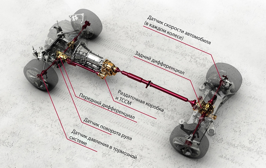 В раздаточной коробке, вживлённой в «автомат», трудится многодисковое сцепление в масляной ванне, обеспечивающее плавное регулирование крутящего момента, подаваемого вперёд, в соответствии с инструкциями модуля управления раздаточной коробкой (TCCM), который отслеживает уровень сцепления и действия водителя, распределяя тягу между передней и задней осями в нужном соотношении.