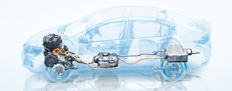 Как и у соплатформенников, топливный бак в этом седане размещён под передними сиденьями. Под полом багажника в гибридной версии спрятана тяговая батарея.