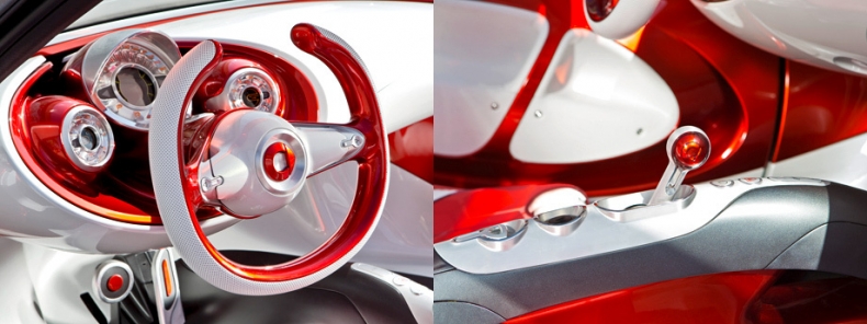 Да, как ни удивительно, но этот Смарт может похвастаться приличным багажником длиной 900 мм и неназванного объёма. Причём для перевозки длинномеров переднее пассажирское сиденье можно снять. Концепт Smart Forstars будет представлен на Парижском автошоу как воплощение будущего дизайнерского языка компании из Хамбаха. На премьерную Францию намекает сложный ярко-красный окрас с названием Alubeam rouge, который контрастирует с матово-серым цветом традиционной смартовской клетки безопасности Tridion.